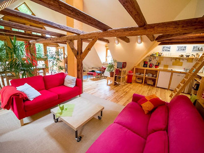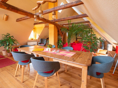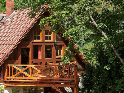 The holiday flat in the half-timbered house is located directly on the Harz monastery hiking trail and the R1 long-distance cycle path in the large, beautiful garden of the listed Mühlenhof in Thale.