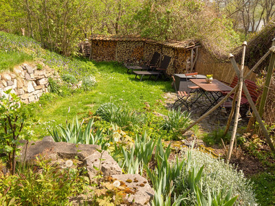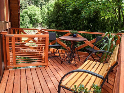 The holiday flat has a large, open-plan living/kitchen area, a bedroom, a sleeping area, a balcony between the trees and a large garden with a barbecue area for relaxing.