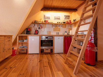 In the master bedroom there is a 2m x 2m double bed and a smaller 1.40 m long x 0.70 wide children's bed. The second sleeping level in the pitched roof can be reached via a wooden staircase from the living area and has a blackout skylight. It is separated from the living area by a small door with a curtain and has a 1.40 m wide x 2 m long double bed and a smaller 1.65 m long x 0.90 m wide bed. The children especially like to sleep here.